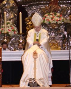 El postrado ante el Arzobispo de Sevilla, Asenjo Pelegrina; es el clérigo Gómez Sierra, ascendido a Obispo por el “mérito” de haber sido el último Cura-banquero presidente de la quebrada Cajasur de la “Santa” Iglesia Católica.
